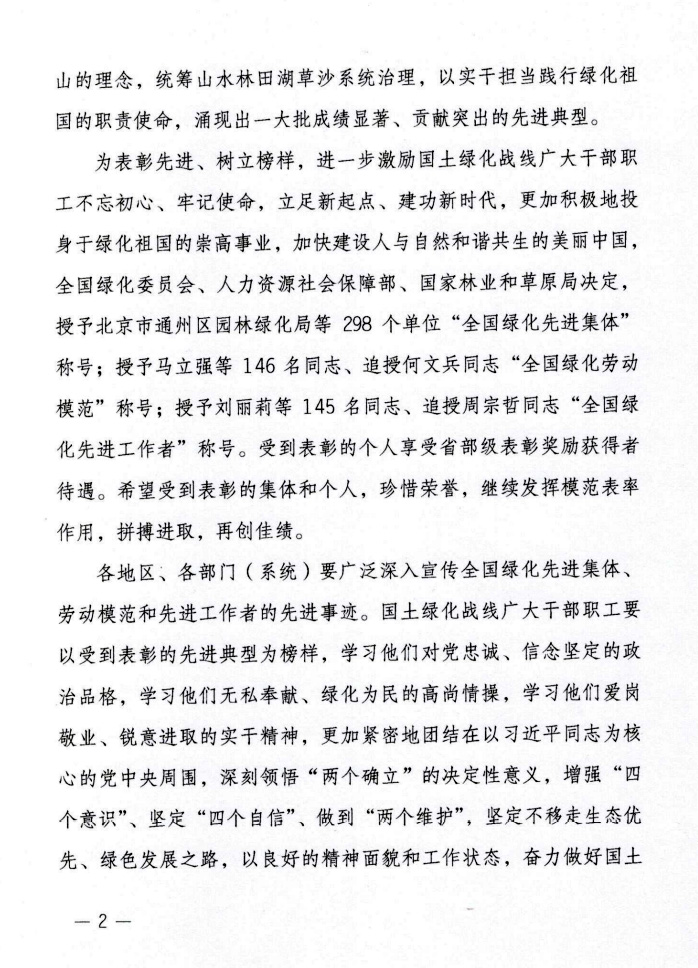 《决定》指出该奖项目的是表彰先进、树立榜样,进一步激励国土绿化战线广大干部职工不忘初心、牢记使命,立足新起点、建功新时代,更加积极地投身绿化祖国的崇高事业,加快建设人与自然和谐共生的美丽中国;希望受到表彰的集体和个人,珍惜荣誉,继续发挥模范表率作用,拼搏进取,再创佳绩;各地区、各部门(系统)要广泛深入宣传全国绿化先进集体、劳动模范和先进工作者的先进事迹。