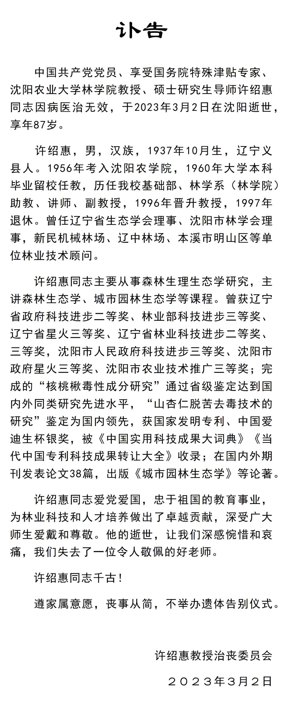许绍惠同志讣告