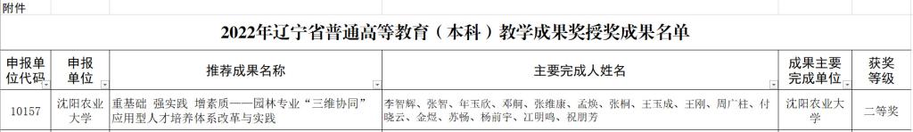5月24日,教育厅公布了2022年辽宁省高等教育本科教学成果奖获奖名单,我院教师李智辉、张智、年玉欣、邓舸、张维康等16人完成的教学成果《重基础 强实践 增素质——园林专业“三维协同”应用型人才培养体系改革与实践》获二等奖。