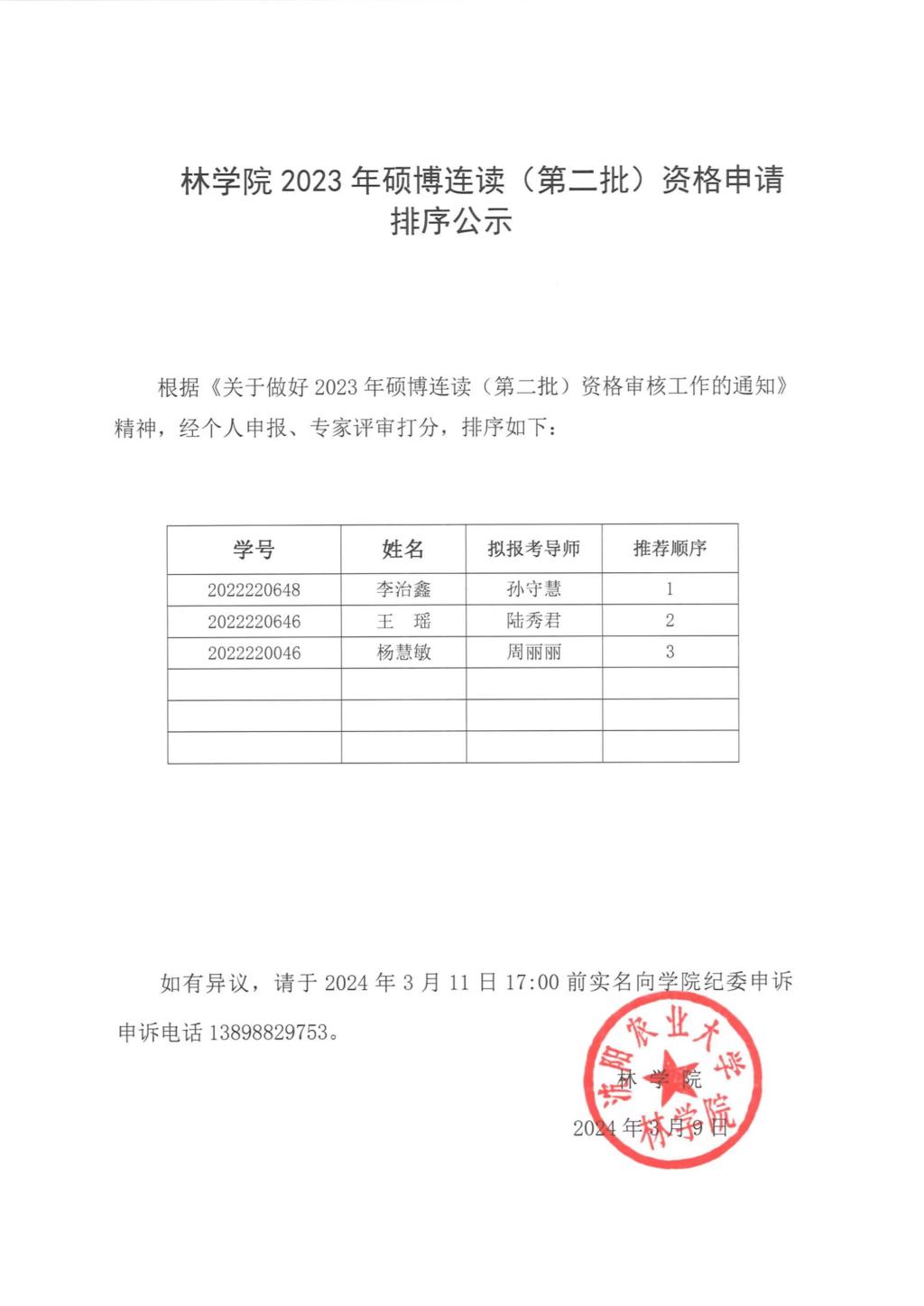 林学院2023级“直接攻博”类研究生申请人排序公示