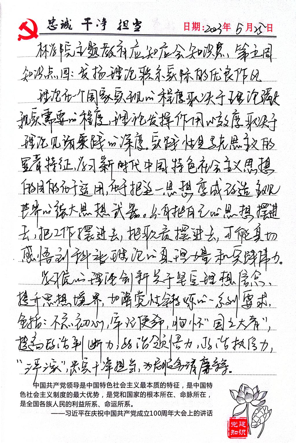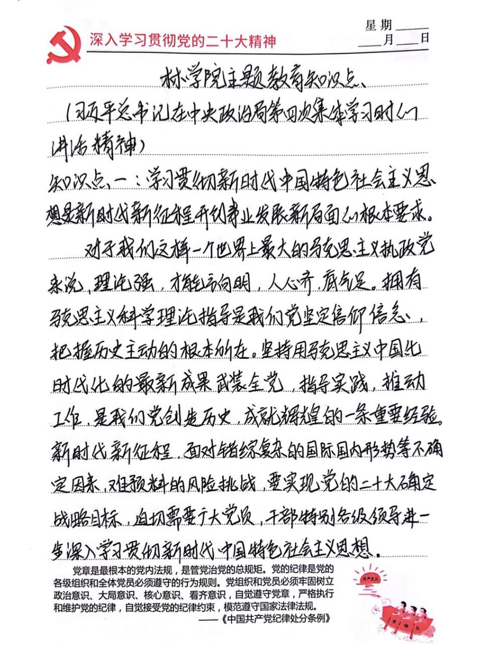 作为一名党员,我认真围绕“学思想、强党性、重实践、建新功”的总要求,切实把自己的思想和行动统一到主题教育和党的二十大精神上,强化理论学习,原原本本学、反反复复读,真正做到学深悟透,切实增强学习的积极性、主动性、自觉性,忠实履行新时代赋予青年的使命任务。