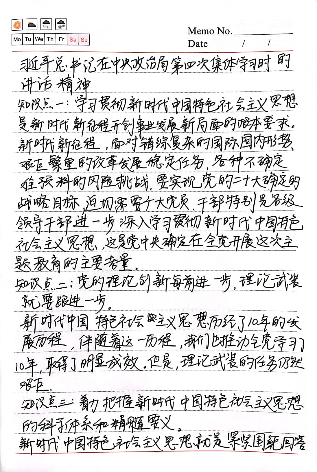 强化理论学习,接受思想洗礼,是中国共产党人的必修课,更是开展主题教育的题中之义。通过学习习近平总书记在中央政治局第四次集体学习时的讲话精神,我对习近平新时代中国特色社会主义思想有了更加系统全面地理解和领悟。在接下来的工作中,我将以知促行,学用结合、以学促干,自觉用习近平新时代中国特色社会主义思想武装头脑、指导实践、推动工作,把思想伟力转化为实践动力。