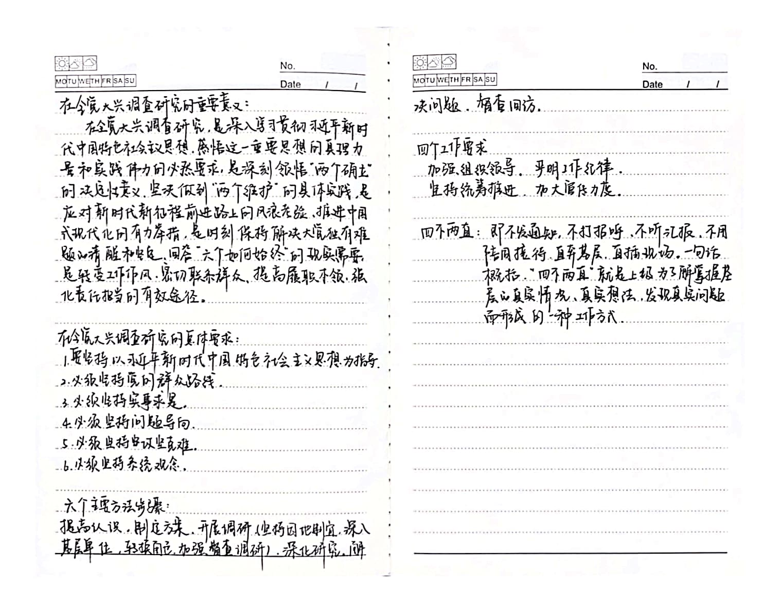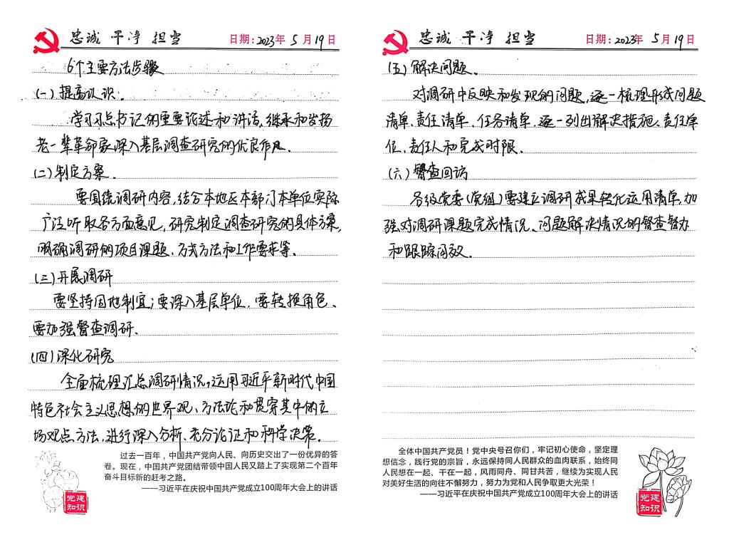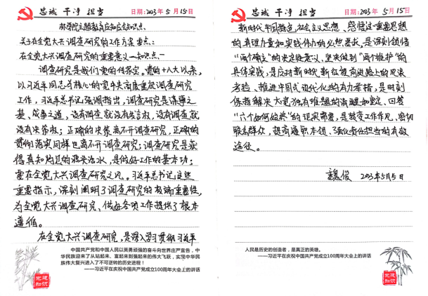 通过这一周的学习,我明确了在全党大兴调查的意义与总体要求。作为一名学生党员,我们在科研任务中也要做好调查研究,做好工作的基本功,在科研任务中也要严谨认真,做好前期工作才能作出正确的决策,为科研任务研究打下良好基础。