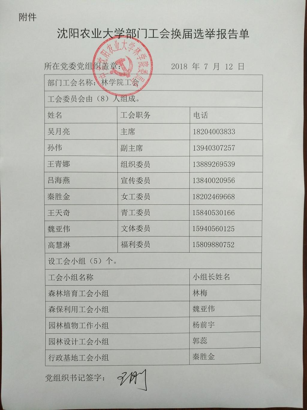 2018年7月12日林学院召开工会会员代表大会,按照《中华人民共和国工会法》有关规定和沈阳农业大学工会文件的通知要求,在学院党委的支持下,完成了林学院工会委员会换届选举工作,林学院新一届工会委员会的名单见附件: